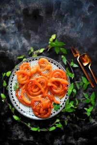 Jalebi – Deep-fried coils soaked in saffron syrup, hot and sticky.